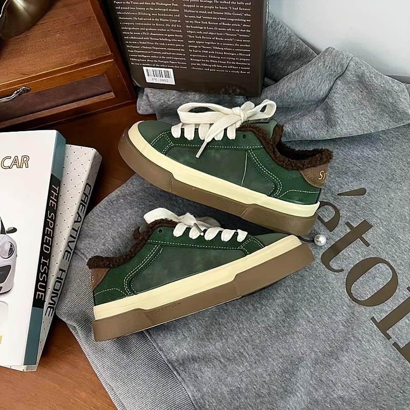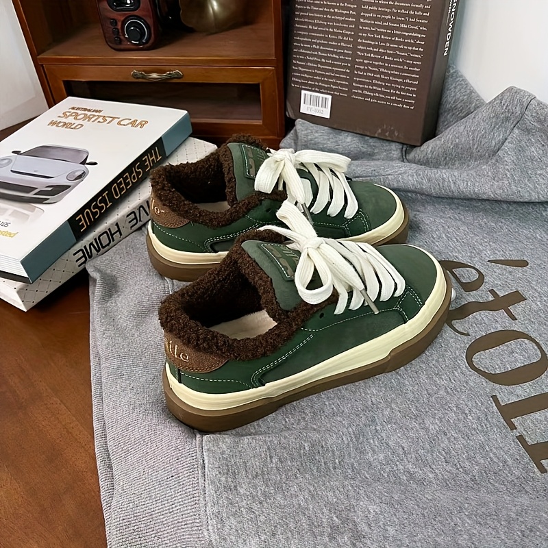 Women'S Fleece-Lined Warm Flat Skate Shoes, Lace-Up Snow Sports Shoes, Retro Minimalist Design, Low-Top Round Toe, Comfortable And Warm, Suitable for Daily Casual Wear in Autumn And Winter, Outdoor Hiking.